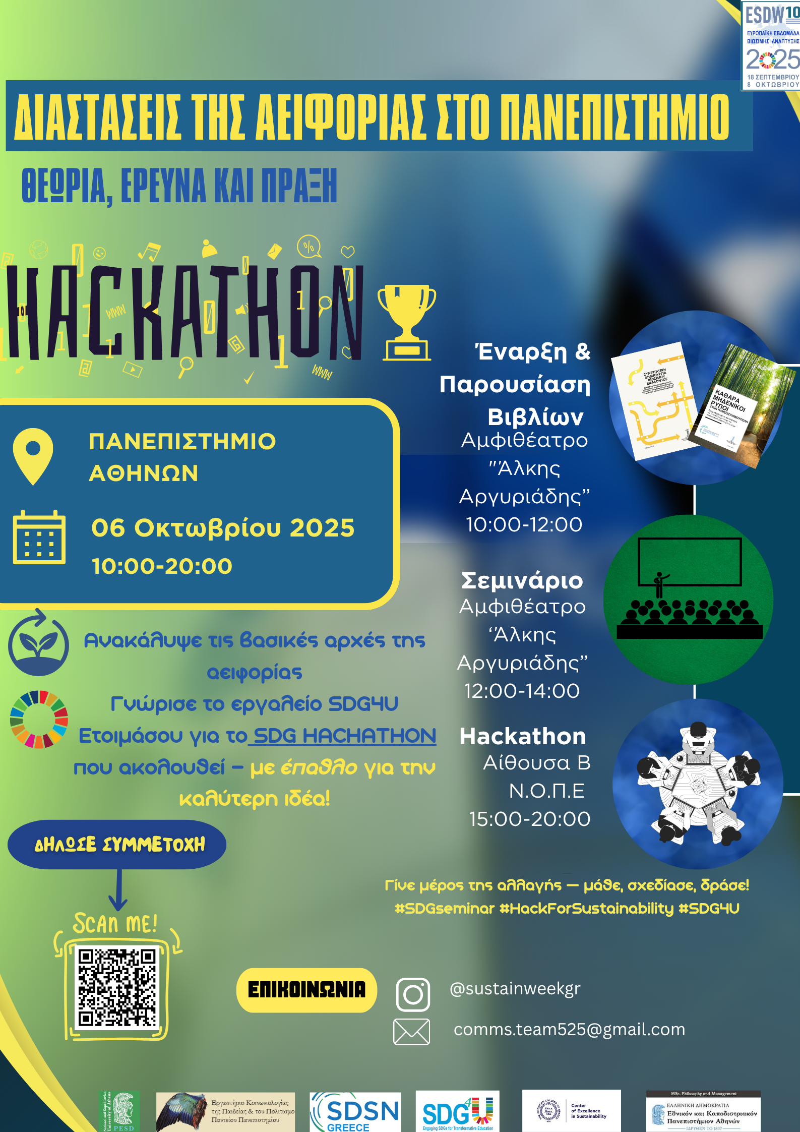 • δια ζώσης σεμινάριο με θέμα «Εισαγωγή στις διαστάσεις της Αειφορίας», αφιερωμένο στους Στόχους Βιώσιμης Ανάπτυξης (SDGs),  καθώς και ένα webinar στο οποίο θα παρουσιαστεί το ευρωπαϊκό ερευνητικό έργο SDG4U