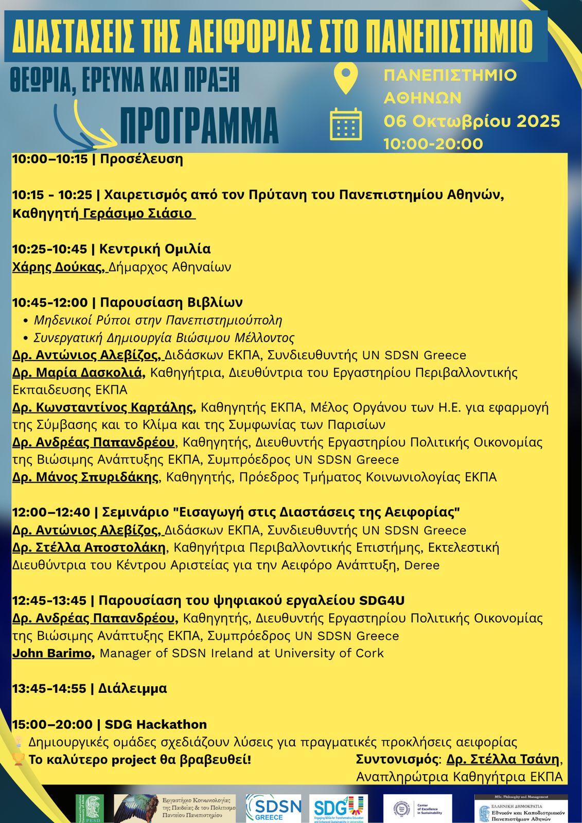 Επιστημονικοί υπεύθυνοι της εκδήλωσης είναι ο Καθηγητής Ανδρέας Παπανδρέου, Διευθυντής του Εργαστηρίου Πολιτικής Οικονομίας της Βιώσιμης Ανάπτυξης ΕΚΠΑ και Συμπρόεδρος της UN SDSN Greece, και ο Δρ. Αντώνιος Αλεβίζος, Διδάσκων στο ΕΚΠΑ και Συνδιευθυντής της UN SDSN Greece.